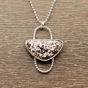 A unique piece of ocean jasper that was cut and polished by Georgette. Set in a handmade, sterling silver setting on a faceted ball chain. Polished to a high shine.